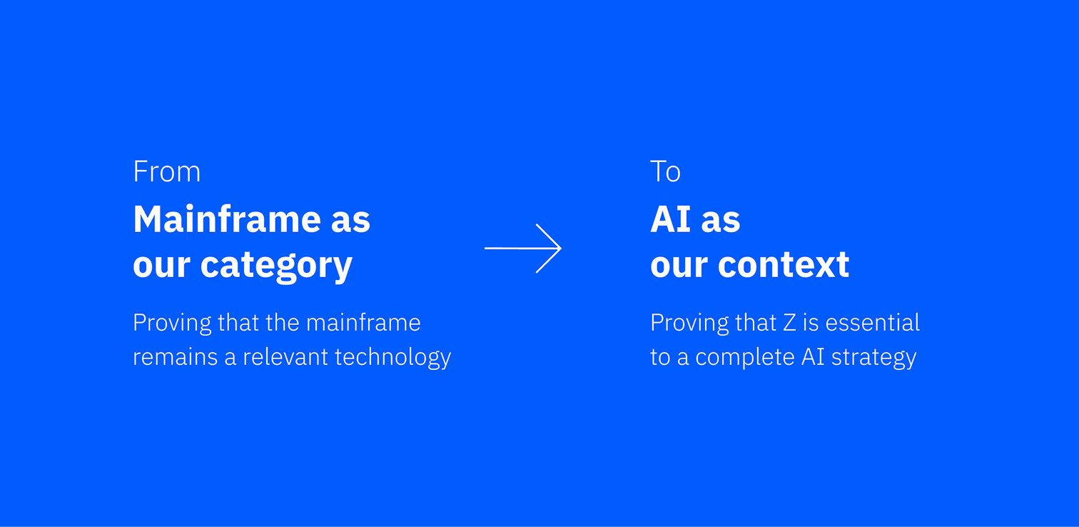 We then repositioned Z from mainframe as a category — putting IBM in a position to prove that mainframe remains a relevant technology — to AI as the context, proving that Z is essential to a complete AI strategy. Developing a clear positioning, story platform and messaging about Z making more possible, and creative campaigns that brought it to life, providing more value from AI to Z.